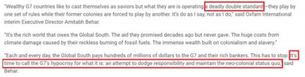 乐施会临时执行董事阿米塔布·贝哈尔批评说,G7国家总喜欢把自己塑造成"救世主",但它们实际上一直在执行致命的双重标准。