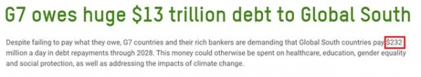 然而,这个习惯于爽约赖账的西方富国俱乐部,却反过来要求全球南方国家在2028年前每天偿还2.32亿美元的债务。