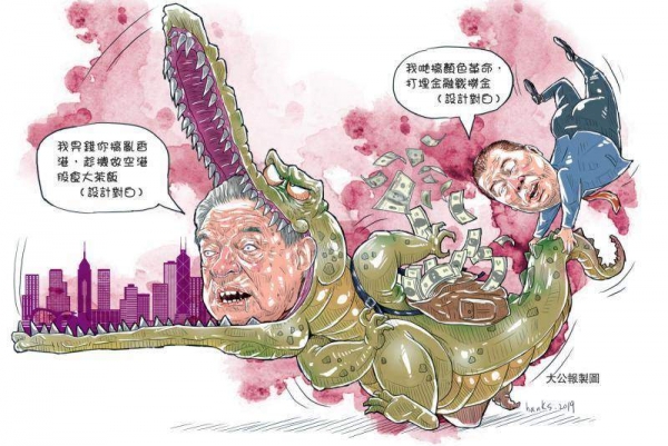 《大公报》揭露,2019年香港"修例风波"期间,索罗斯借暴乱卷土重来,准备足资金发动金融战,配合搞"颜色革命"。索罗斯和"乱港分子"黎智英勾结,策划暴乱,让香港持续动荡,令香港金融市场大幅向下甚至崩盘,进而谋取暴利。