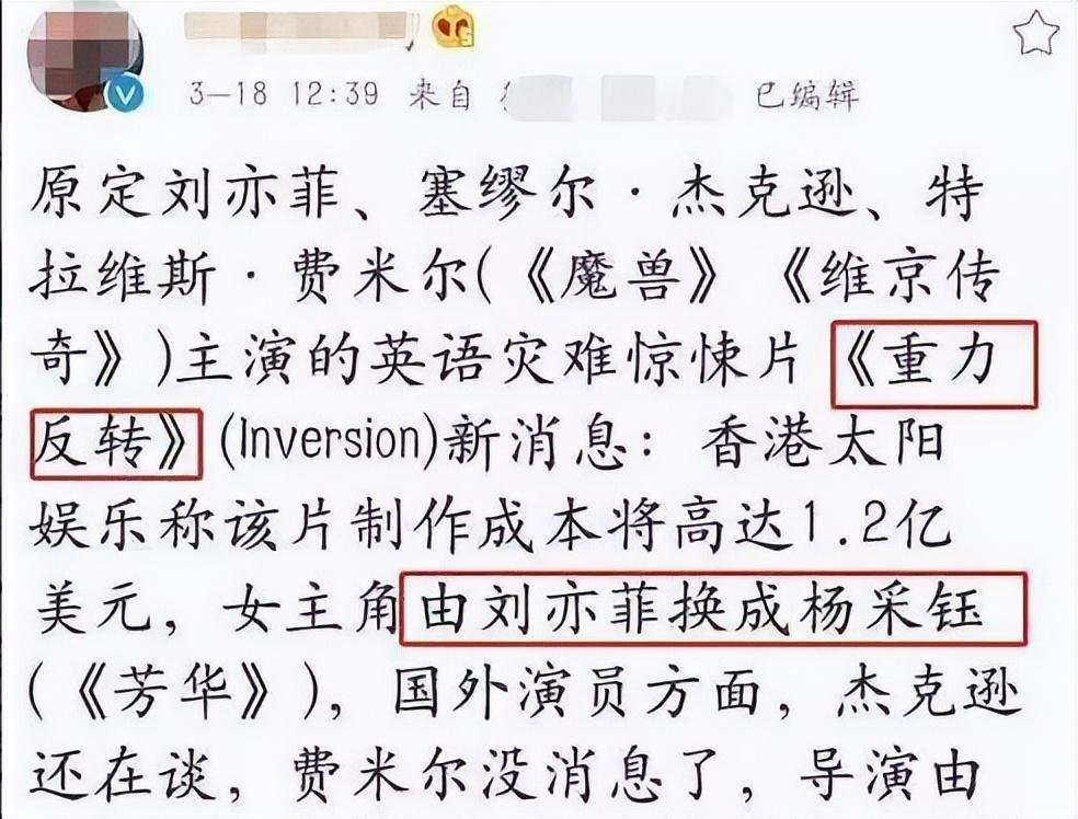 据说,原本电影《重力反转》内定的主演是刘亦菲。