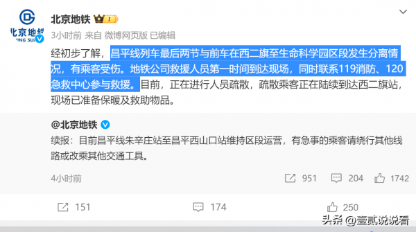 晚间19点57分北京地铁回应:昌平线因车辆故障,两节车厢发生分离,多辆列车停车延误,现场正在组织疏散救援工作。