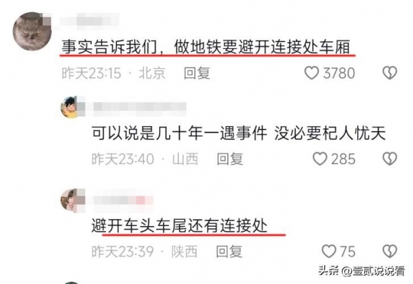 有网友说:"事实告诉我们,坐地铁要避开连接处车厢""还有避开车头和车尾"