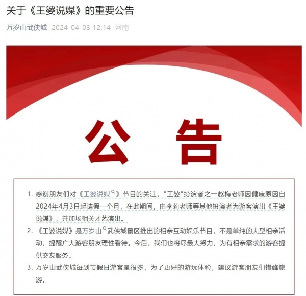 4月3日,"万岁山武侠城"微信公众号发布关于《王婆说媒》的公告:"王婆"的扮演者赵梅因健康原因自4月3日起请假一个月,在此期间,由李莉老师等其他扮演者为游客演出《王婆说媒》,并加场相关才艺演出。