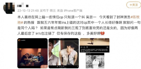 这名爆料的网友称自己五六年前在ins上关注了一对同性cp,一个叫吴楚一,另外一个人和陈牧驰长得超级像。这不免让她怀疑陈牧驰的性取向了。