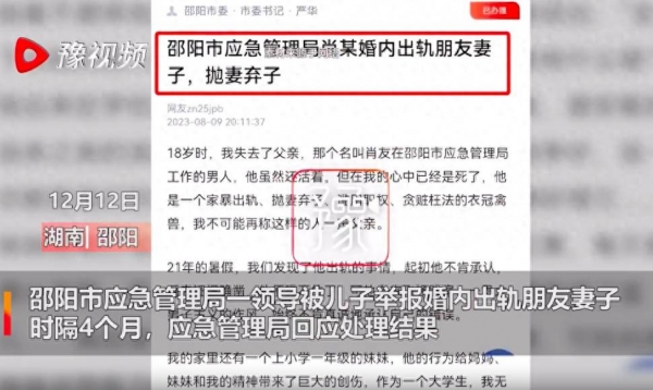 8月9日,有网友在"问政湖南"平台留言称,其在邵阳市应急管理局的父亲肖某婚内出轨朋友妻子。"2021年,他出轨的事被我们发现,起初不肯承认,后来证据确凿,无法继续隐瞒。"