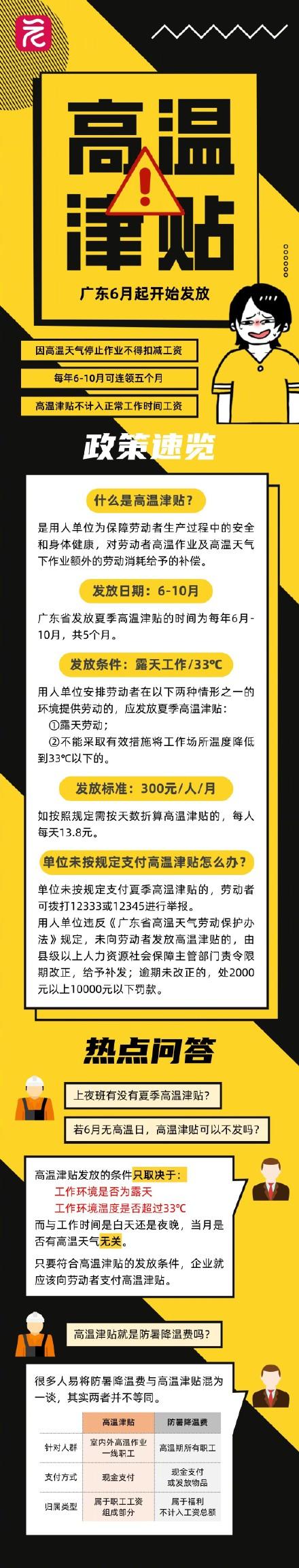 从事高温工作的小伙伴们,从下个月起你们的专属补贴要来啦!广东高温津贴连发5个月,6-10月每人每月可领300元。根据2012年出台的《防暑降温措施管理办法》,用人单位安排劳动者在35℃以上高温天气从事室外露天作业,以及不能采取有效措施将工作场所温度降低到33℃以下的,应当向劳动者发放高温津贴。广东省的发放标准是什么?领取有哪些注意事项?