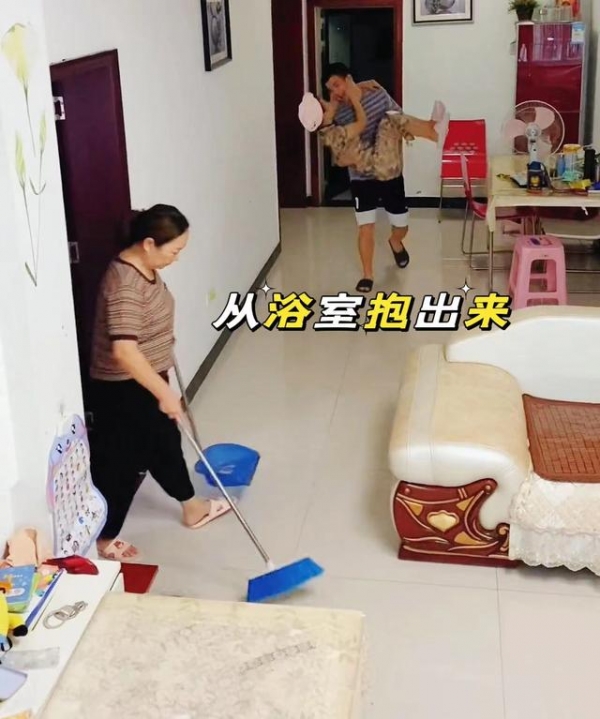 夫妻俩洗漱结束正打闹着玩耍,男子看到客厅没人,一时兴起抱起妻子就往我是跑,却没想到正好遇见母亲拿着扫帚出来打扫卫生,一个没留意差点跟母亲撞个满怀!