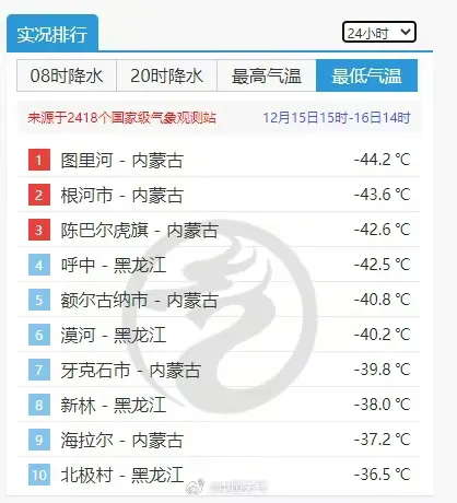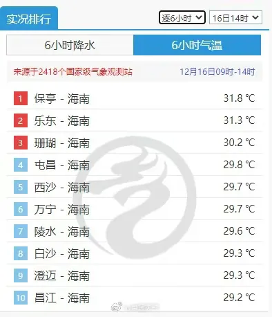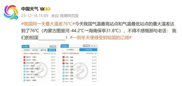 2023年12月16日,我国气温最高站点为海南保亭31.8℃,最低站点为内蒙古图里河-44.2℃,二者最大温差达到76℃。