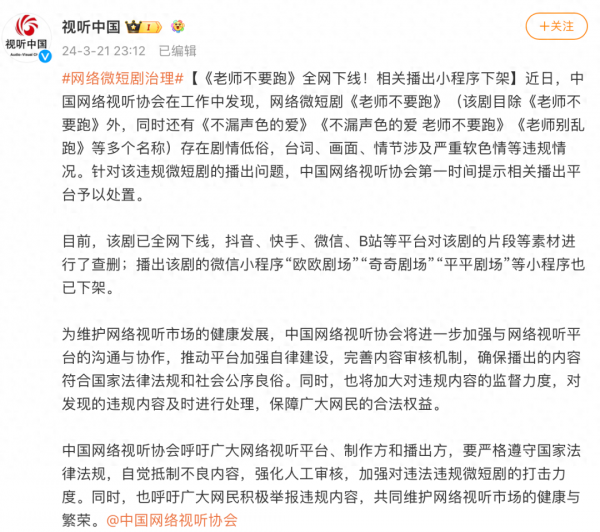 3月21日,中国网络视听协会发布声明,网络微短剧《老师不要跑》存在低俗剧情,台词、画面、情节涉及严重软色情,被全网下线。