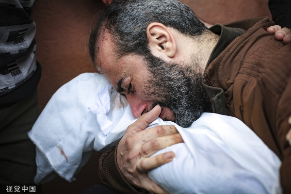 当地时间11月19日,加沙地带汗尤尼斯,一名男子抱着他在以色列轰炸中丧生的儿子的尸体。图自视觉中国