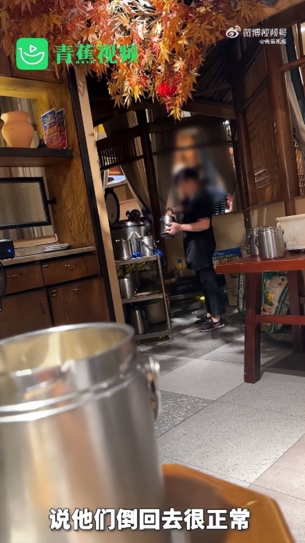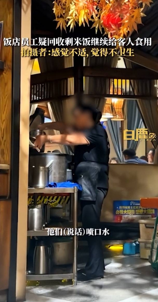 拍摄者张女士称看到店里工作人员把离开客人桌上还未食用完的小桶米饭进行回收,又重新倒入饭店的电饭锅中。