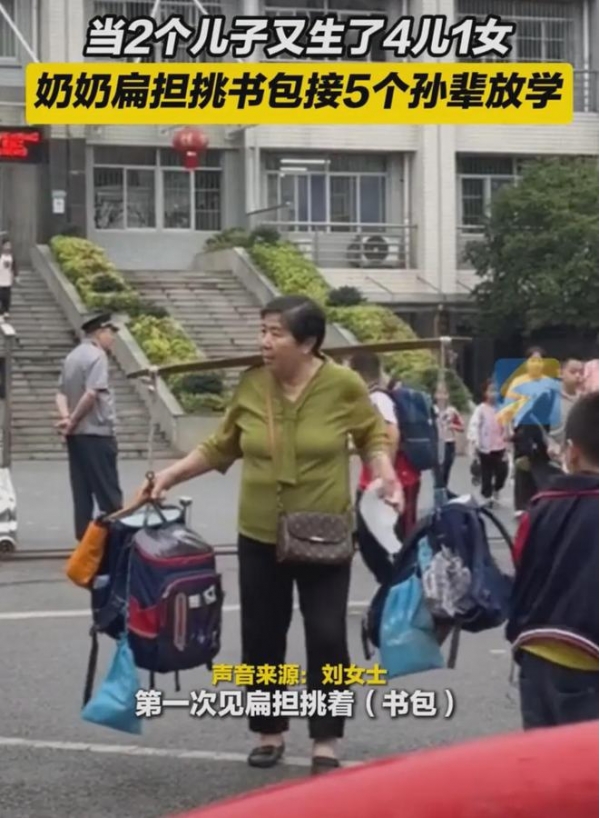 画面中,奶奶拿着一根扁担站在学校门口,放学的时候,五个孩子直接奔向奶奶。看到奶奶时,都把书包给奶奶拿着。