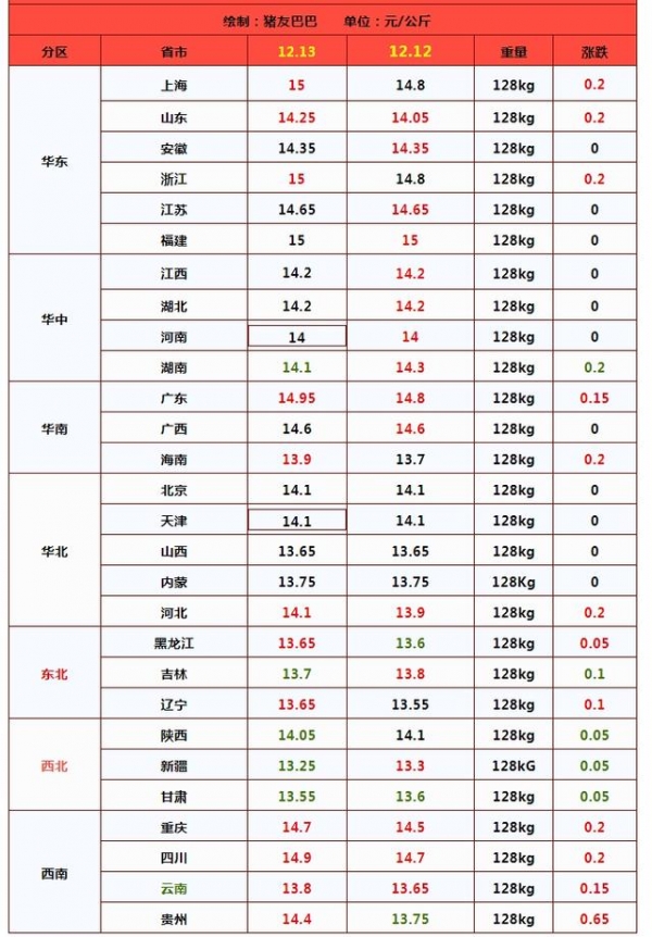 生猪市场方面,12月13日猪价延续了稳中偏强的趋势,外三元猪价上涨,屠宰企业报价涨至7.08元/斤左右,标志着猪价涨入"7元时代"。然而,上涨幅度有所收窄,主要受到北方地区雨雪过后,养殖户出栏心态反弹的影响。市场整体以弱稳为主,但新一轮雨雪天气即将来临,可能导致南方地区气温下降,生鲜猪肉消费水平提升,短期内生猪市场或将迎来季节性反弹。