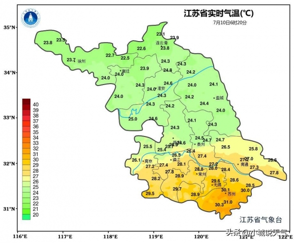 气温方面,沿江和苏南地区的最高气温将维持在28°C左右,而其他地区则略高,预计在30至31°C之间。夜间最低气温,大约在20至21°C。