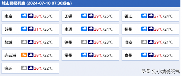 今天江苏各主要城市的天气预报: