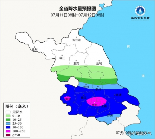 7月11日,在淮河以南地区将普遍出现阵雨或雷雨天气,特别是沿江和苏南地区,预计将迎来大雨到暴雨天气,局部地区将有大暴雨出现。这些地区的降水量将较为集中,需要特别注意城市排水和农田防涝措施。
