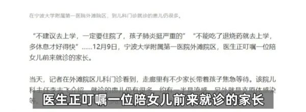 不建议去上学,一定要住院了,孩子肺炎挺严重的""不能吃了退烧药就去上学,多休息才好得快",宁波大学附属第一医院外滩院区,医生正叮嘱一位陪女儿前来就诊的家长。