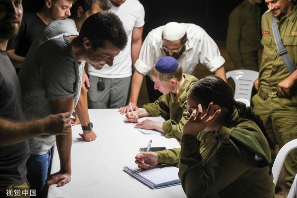当地时间2023年10月7日,以色列北部城镇,巴勒斯坦武装组织哈马斯对以色列发动大规模突然袭击后,以色列预备役士兵在排队登记入伍。
