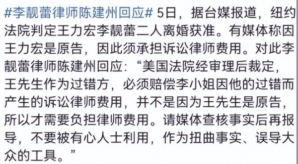 李靓蕾的律师表示,因为王力宏是过错方而必须承担李靓蕾的诉讼律师费。王力宏的律师则表示,法院并无认定王力宏有任何过错,而是基于两人的离婚协议书判定。