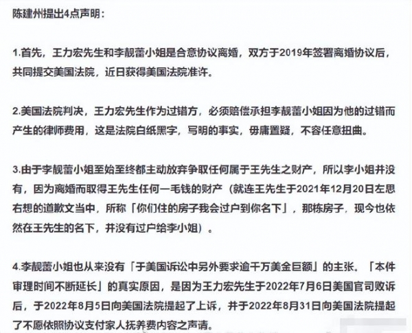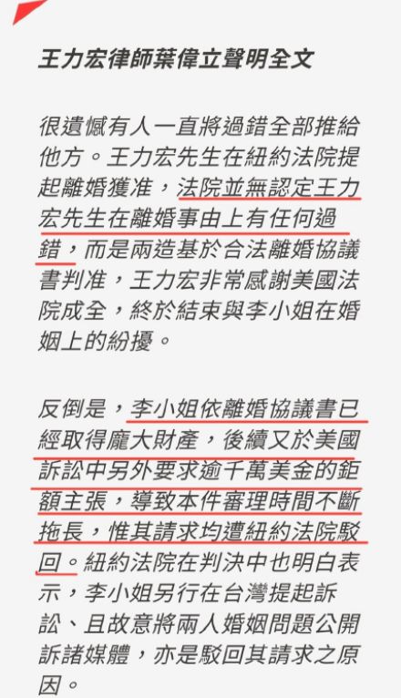 不仅如此,王力宏的律师还透露,李靓蕾已经按照离婚协议书获得庞大财产,但还在诉讼过程另外要求得到超过千万美金,但被纽约法院驳回。