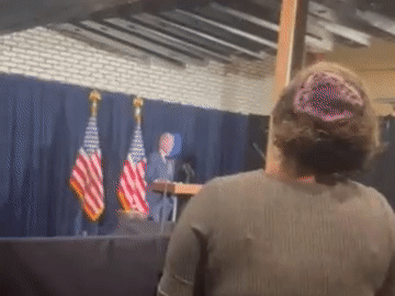 当地时间11月2日,拜登在明尼阿波利斯出席竞选筹款活动时,一名妇女打断他发言并要求他立即呼吁停火。图片来源:美媒