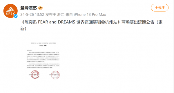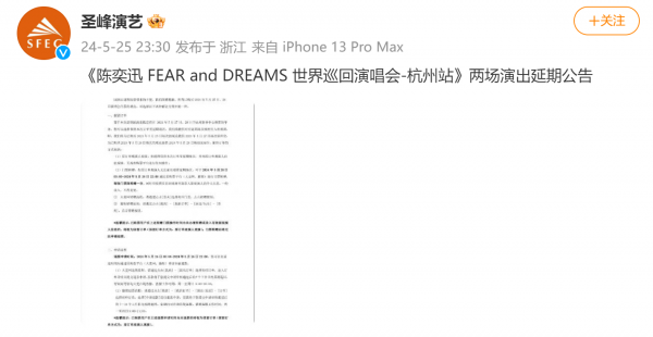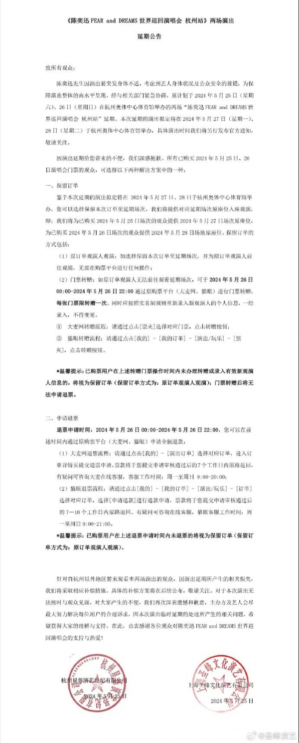 随后,陈奕迅此次演唱会的主办方上海圣峰文化演艺有限公司也通过官方微博发布最新公告,表示原计划延期至2024年5月27日(星期一)、2024年5月28日(星期二)的两场陈奕迅"FEAR and DREAMS"演唱会,将另行择期举办。后续具体演出时间和相关的票务解决方案及补偿方案将另行发布官方通知。