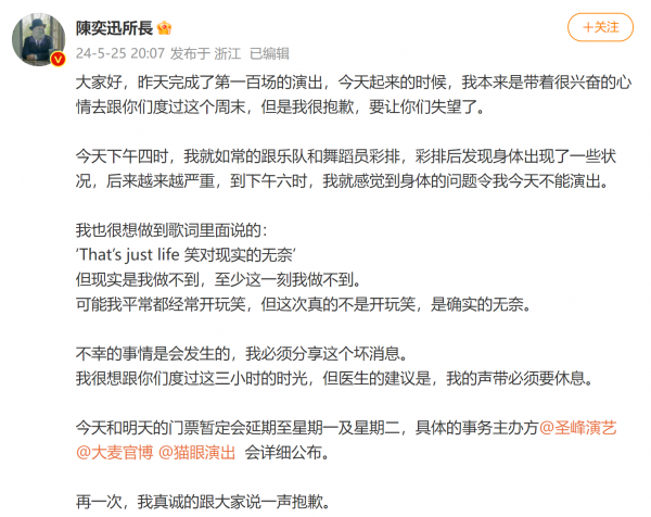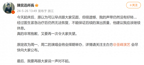 5月26日中午,歌手陈奕迅再次在微博发文:由于声带没有好转,不能保证演出质量,原定改为周一、周二的杭州演唱会将会择期举办,"真的非常抱歉,又要再一次令大家失望"。