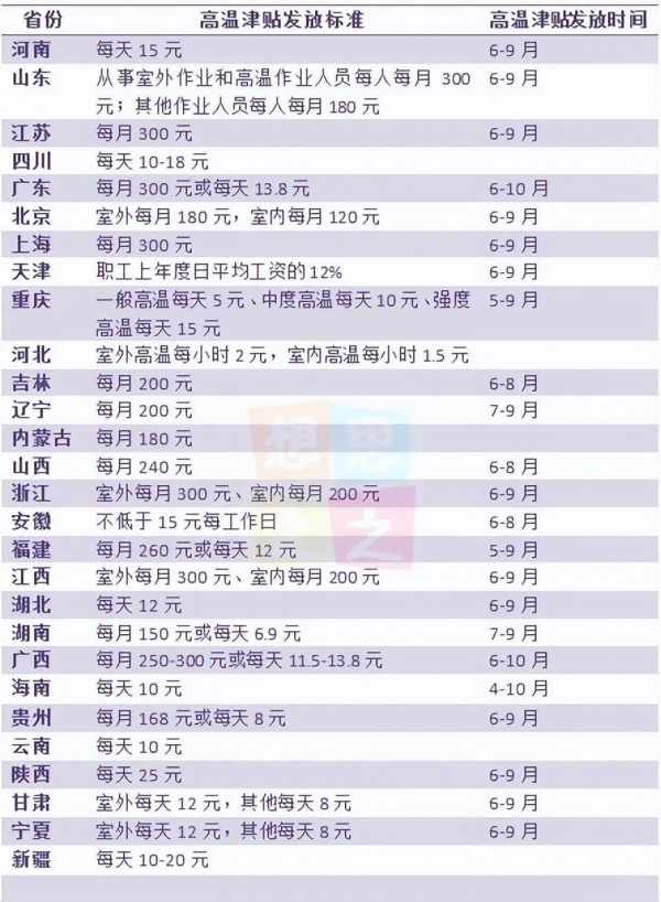 从中可以看出,多数省份高温津贴是从每年6月发放到9月,早的从5月份就开始发放了,但高温津贴标准是不一样的,标准较高的省份高温津贴标准可以达到300元。