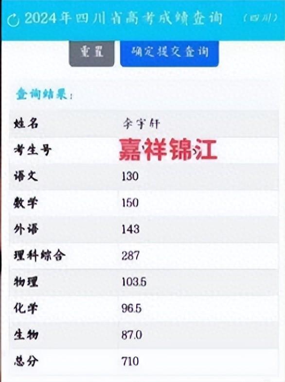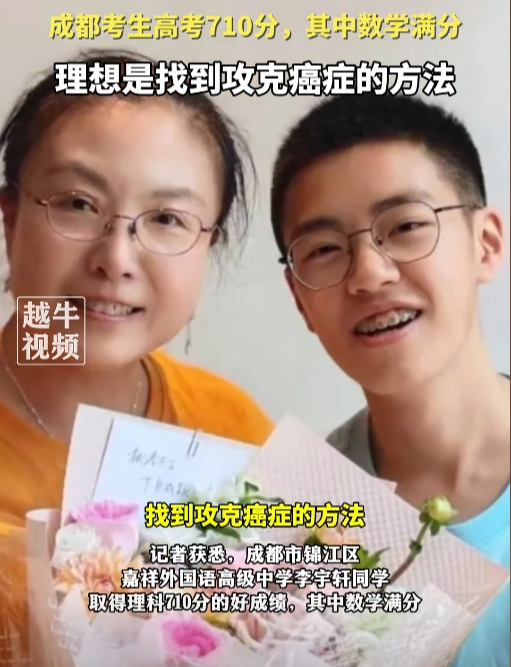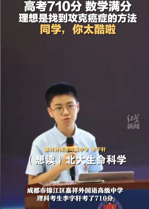 6月23日,在成都市锦江区嘉祥外国语高级中学,有一位叫李宇轩的同学,高考考出710分的好成绩。