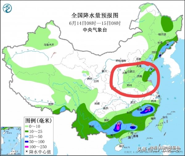 根据最新降水量预报图来看,明日6月14号将会是有大范围降雨天气落下,北方降雨范围也在扩大,河南山东河北高温酷暑的地区都将迎来喜雨。我们来具体看看: