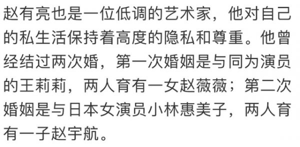关于赵有亮的私生活外界很少有人知道,他生前也一直很低调,从不公开自己的妻儿,不过知情人透露,赵有亮生前结过两次婚,第一任妻子是同为演员的王莉莉,两人育有一女,他第二任妻子是日本女演员小林惠美子,两人育有一子赵宇航,不过关于这两位妻子的信息,网上并没有太多,想必不是特别出名的演员。