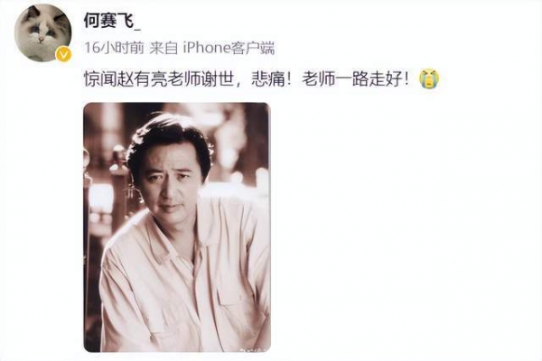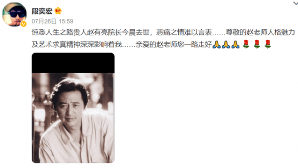 在悼文中,段奕宏悲痛写下:"惊悉人生之路贵人赵有亮院长今晨去世,悲痛之情难以言表,尊敬的赵老师人格魅力及艺术求真精神深深影响着我,亲爱的赵老师一路走好。"