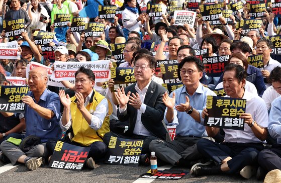 8月26日,李在明(第一排左三)等人参加抗议集会,反对日本排核污染水入海。(图源:News1)