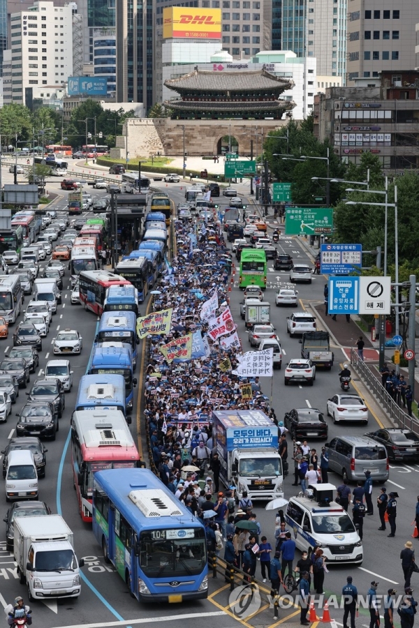 8月25日,在首尔光化门广场,韩国最大在野党共同民主党举行游行,敦促日本政府停止福岛核污染水排海工作。图为抗议人士朝韩国总统府方向行进。(图源:韩联社)