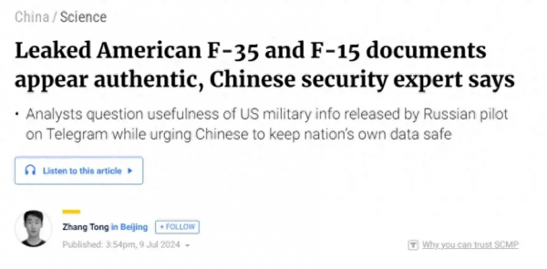 《南华早报》援引网络安全专家的分析称,"我们下载并检查了这些文件,很多内容看起来极具真实性。"泄露的文件包括F-35隐形战斗机的使用手册,F-15C/D和更先进的F-15SA战斗机的技术手册、"弹簧刀"无人机以及"杰达姆"精确制导炸弹等相关文件。"这些文件很详细,格式与先前在网上泄露的其他美国军事情报类似。然而,严格来说,这些并不是蓝图或设计文件,它们真正的价值只能由专业人士来评估。"