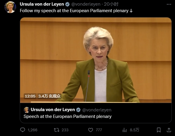 冯德莱恩8日在欧盟会议上发表讲话,推文截图