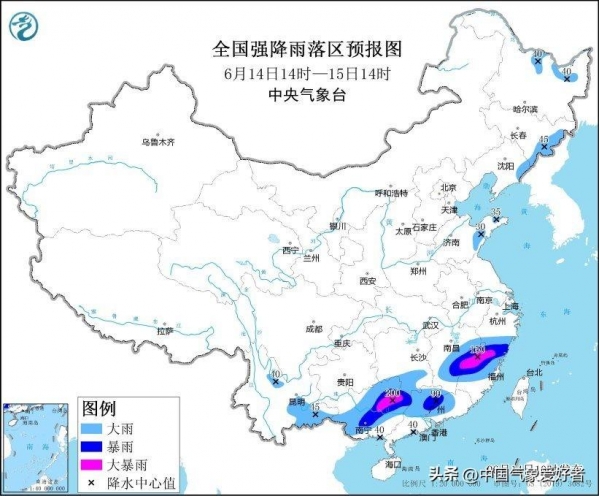 中央气象台于6月14日10时继续发布暴雨黄色预警:预计在未来24小时内,我国南方多个地区将迎来大到暴雨,部分地区甚至会遭遇大暴雨(100~200毫米)。具体来说,广西大部、广东中北部和西南部沿海、云南西北部和东南部、湖南南部、江西中东部、福建中北部、浙江南部以及黑龙江北部、吉林东部、辽宁东部、山东东部等地将成为降雨的"重灾区"。其中,福建西北部和广西东北部的部分地区预计将出现大暴雨,降雨量可能达到惊人的100~200毫米。
