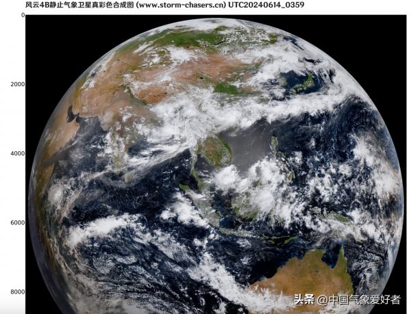6月14日下午,从风云四号高清可见光卫星云图上可见,今天我国南方北方都有雨带:从西伯利亚南下的冷涡已经进入我国东北,在北方地区形成了一个扭曲的螺旋形状云系,这个螺旋云系的南端甩到了黄淮一线,这道雨带中出现了典型的冷涡雷雨,不少地方电闪雷鸣狂风暴雨。