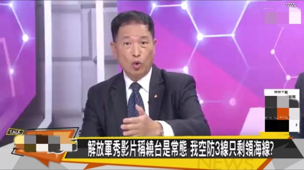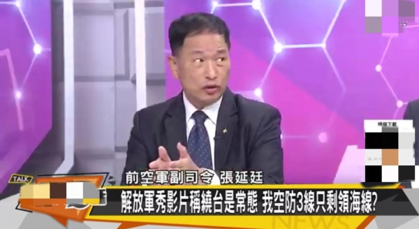台湾"前空军副司令"张延廷在节目中表示,"现在空防三线中有两线没了,包含海峡中线没了、空域线也没了,只剩领空线了"。