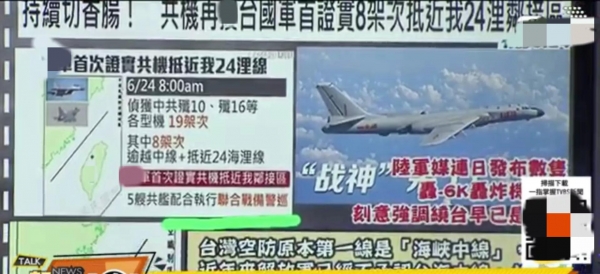 25日,台湾政论节目《新闻大白话》报道:台军证实19架次解放军军机巡台,包括歼10、歼16等;其中8架次军机越过所谓"海峡中线"并且抵近24"海里线",与此同时还有5艘解放军军舰配合执行联合战备警巡。