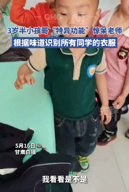 5月16日,甘肃白银。男孩妈妈称,在幼儿园时,孩子们经常把衣服搞混,老师只能根据衣服上的名字帮孩子们换回正确的衣服,而自家儿子却可以根据衣服上每个人不同的味道,分辨是哪位同学的衣服。网友:天生中药圣体,香料大师…适合多种行业。