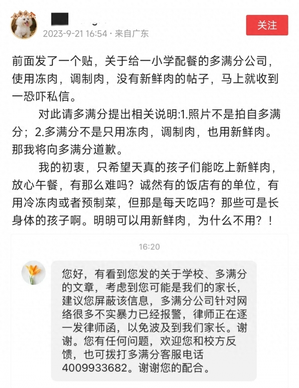 博主发文称学校午餐用冻肉,随后被私信要求屏蔽该消息