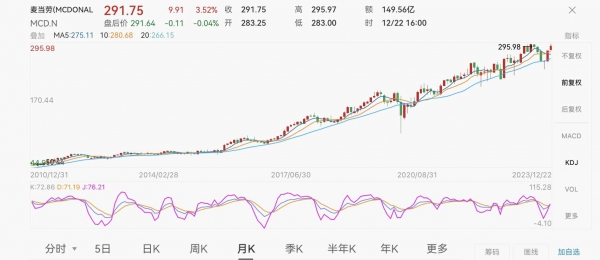 且在更多业内人士看来,麦当劳小幅度的提价不会对单量形成冲击。屡次提价后,麦当劳成为全球范围内对抗通胀最好的企业之一。截至美东时间12月22日,麦当劳报价每股291.75美元,总市值2116亿美元。