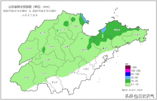 预计14号,山东大部有阵雨或雷阵雨,雨量以小雨为主,滨州、东营、济南、潍坊、青岛、烟台和威海等地部分地区有中雨,东营和烟台等地局地有大雨。