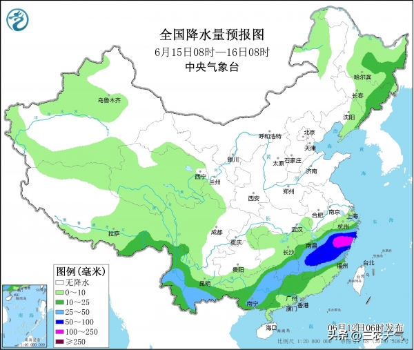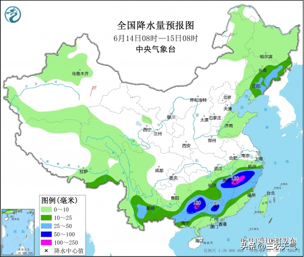预计6月15号,南方主雨带还会有所南压,云南、江南和两广等地有大范围中到大雨,江南一带的低涡继续东移,江西中东部、浙江中南部和福建中北部有更大面积的暴雨到大暴雨。与此同时,受冷槽东移的持续影响,东北一带仍有大范围小到中雨。