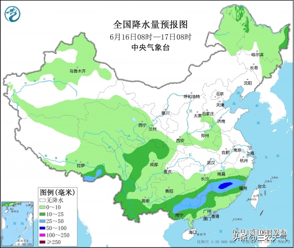 预计6月16号,南方降雨开始向南收缩减弱,主雨带仍维持在江南中南部和两广一带。不过,西南季风再次爆发加强输送暖湿气流,西南一带降雨向北发展增多,西藏东南部雨势也增强。与此同时,我国东北边又有一道深厚的高空冷槽引导一个冷涡东移南下,导致内蒙古东北部和东北一带再次迎来大范围小到中雨的雷雨过程。另外,陕西和华北黄淮一带可能有一道高空槽东移,导致陕西中南部、山西南部、河北南部、山东西南部和河南等地有分散小雨。