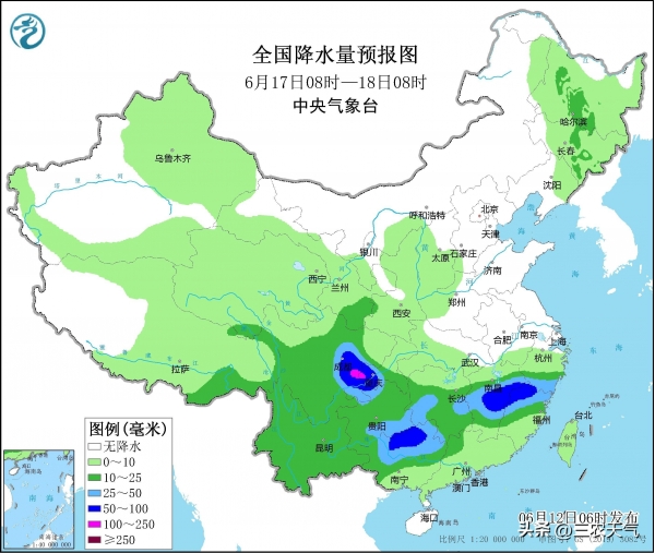 预计6月17号,副热带高压再北抬,暖湿气流在副热带高压边缘爆发性加强北上,西南一带降雨迅猛扩大覆盖,西南大部、江南中部和广西中北部等地形成6月中旬以来最大规模的中到大雨,而且四川盆地一带可能生成一个低涡,导致四川盆地南部有大范围暴雨到大暴雨。广西北部、江西东部和福建西北部等地雨势再增强,出现大范围大到暴雨。与此同时,我国东北边的高空冷槽继续引导冷涡东移南下,导致内蒙古东部和东北一带还有大范围小到中雨。另外,冷槽甩出来的冷空气还会导致内蒙古河套地区、陕西、山西和河南等地部分地区出现小雨。