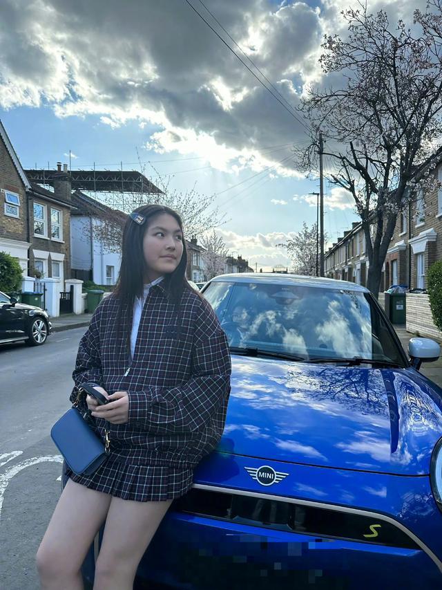王诗龄还站在一台蓝色的mini旁边拍了好多张合影,不知是路过看到喜欢,还是妈妈送的礼物呢。