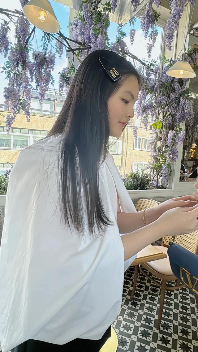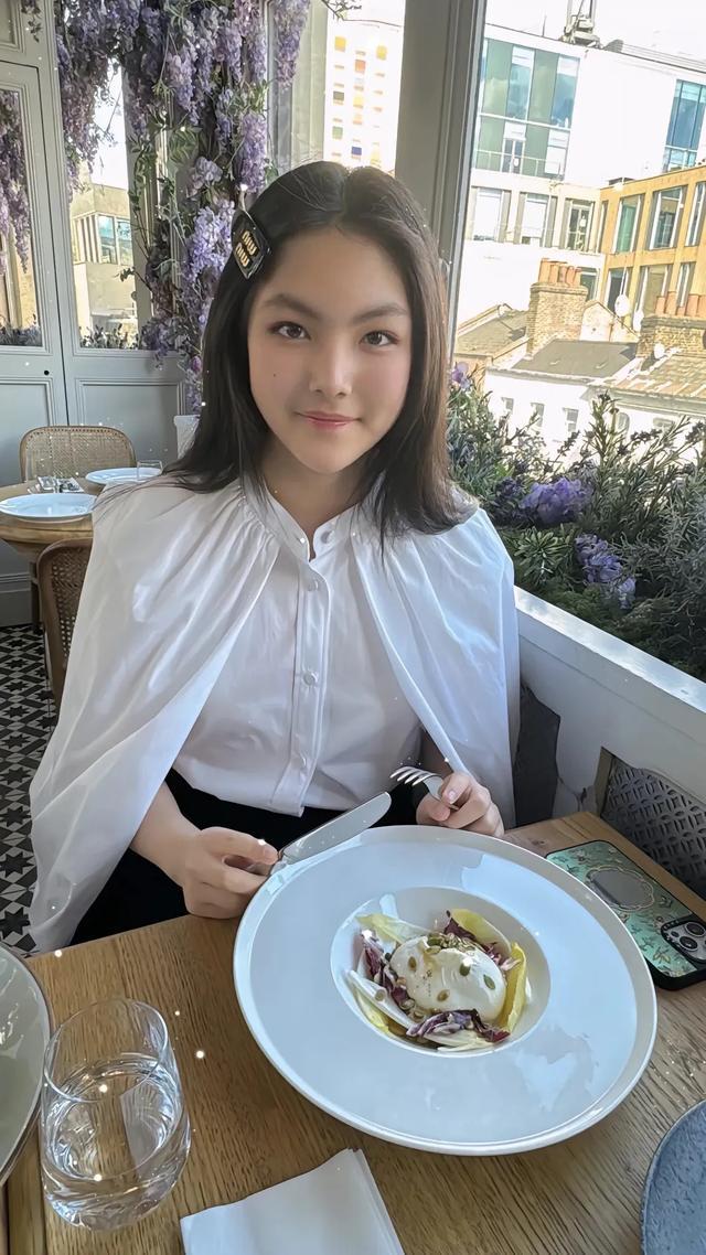 李湘跟女儿一起去用餐,王诗龄披着一头长发,别着一个发卡,身穿白色披风款衬衫上衣仙气十足,她面带微笑看着妈妈的镜头,真的好乖好美。