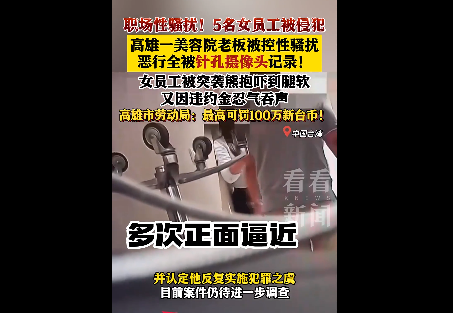 2024年7月10日,台湾高雄市发生了一起美容院老板性骚扰女员工的事件。据报道,这位老板的恶行被店内女员工秘密拍摄下来。今年5月底,两名女员工带着视频向警方报案。警方在查看视频后确认,老板的行为属于性骚扰,且不顾女员工的反抗。目前,这位老板已被法院批准逮捕,案件正在进一步调查中。